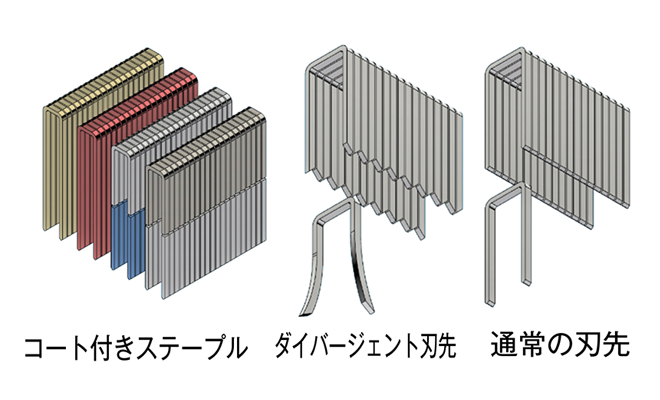 ダイバージェント刃先(左右足先のカットが対称)は木材に打ち込まれた際、刃先が反対方向へ捻れて入り、抜けにくくなります。