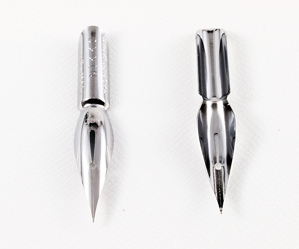 若干の線の強弱(太い線、細い線)と均一な太目の線が書けるペン先です。ペン先を紙に沿って寝かせることで、線の強弱が出ます。均一の太目の線がでます。クローム色で錆に強いことも特徴のひとつです。