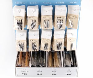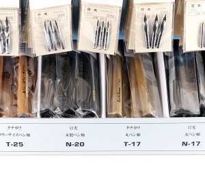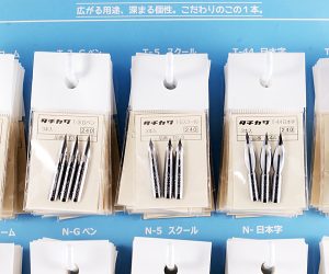 タチカワと日光のつけペン先&専用ペン軸の全種類が用意されています。コンパクトサイズなので場所を取らず、これ一台でつけペン一式の売り場が出来上がります。また、ディスプレイセットはボール紙で作られているので、取扱いに便利です。